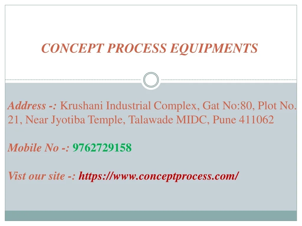 CONCEPT PROCESS EQUIPMENTS Address -: Krushani Industrial Complex, Gat No:80, Plot No. 21, Near Jyotiba Temple, Talawade MIDC, Pune 411062 Mobile No -: 9762729158 Vist our site -: https://www.conceptprocess.com/