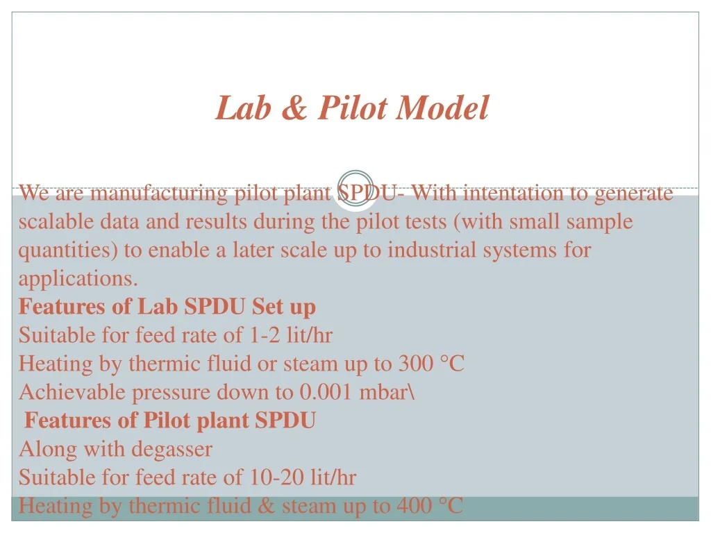 Lab & Pilot Model We are manufacturing pilot plant SPDU- With intentation to generate scalable data and results during the pilot tests (with small sample quantities) to enable a later scale up to industrial systems for applications. Features of Lab SPDU Set up Suitable for feed rate of 1-2 lit/hr Heating by thermic fluid or steam up to 300 °C Achievable pressure down to 0.001 mbar\ Features of Pilot plant SPDU Along with degasser Suitable for feed rate of 10-20 lit/hr Heating by thermic fluid & steam up to 400 °C