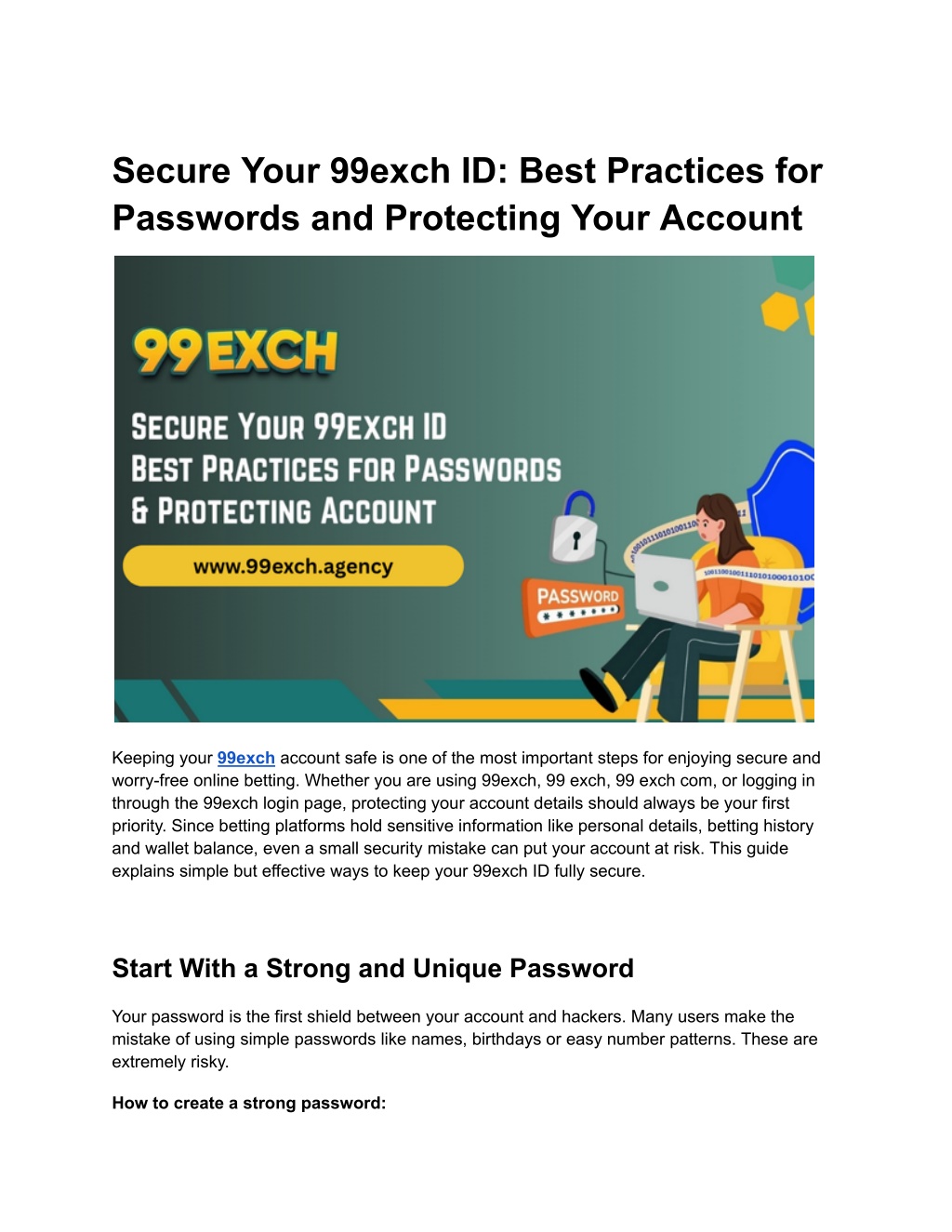 1. Secure Your 99exch ID: Best Practices for Passwords and Protecting Your Account Keeping your 99exch account safe is one of the most important steps for enjoying secure and worry-free online betting. Whether you are using 99exch, 99 exch, 99 exch com, or logging in through the 99exch login page, protecting your account details should always be your first priority. Since betting platforms hold sensitive information like personal details, betting history and wallet balance, even a small security mistake can put your account at risk. This guide explains simple but effective ways to keep your 99exch ID fully secure. Start With a Strong and Unique Password Your password is the first shield between your account and hackers. Many users make the mistake of using simple passwords like names, birthdays or easy number patterns. These are extremely risky. How to create a strong password: