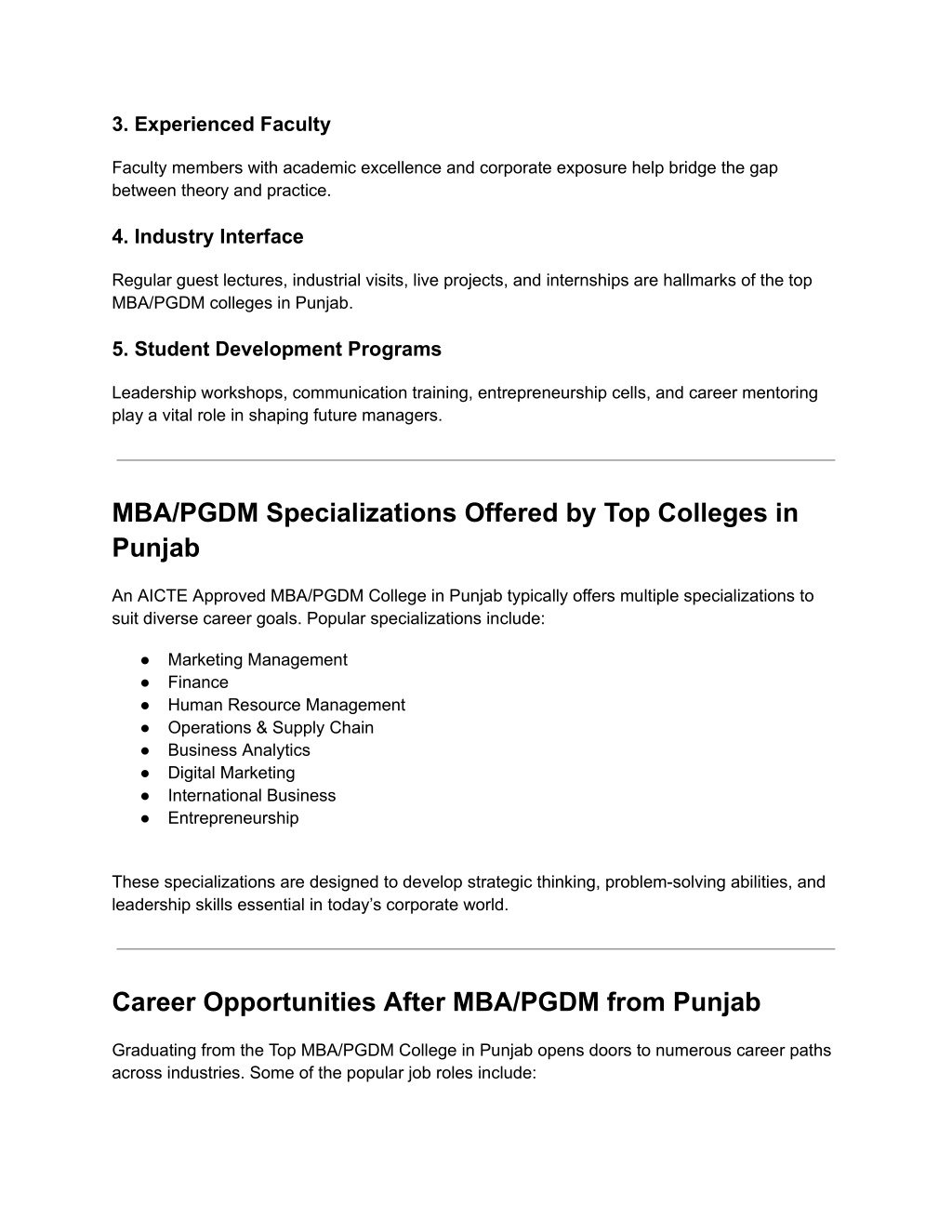 3. Experienced Faculty Faculty members with academic excellence and corporate exposure help bridge the gap between theory and practice. 4. Industry Interface Regular guest lectures, industrial visits, live projects, and internships are hallmarks of the top MBA/PGDM colleges in Punjab. 5. Student Development Programs Leadership workshops, communication training, entrepreneurship cells, and career mentoring play a vital role in shaping future managers. MBA/PGDM Specializations Offered by Top Colleges in Punjab An AICTE Approved MBA/PGDM College in Punjab typically offers multiple specializations to suit diverse career goals. Popular specializations include: ● Marketing Management ● Finance ● Human Resource Management ● Operations & Supply Chain ● Business Analytics ● Digital Marketing ● International Business ● Entrepreneurship These specializations are designed to develop strategic thinking, problem-solving abilities, and leadership skills essential in today’s corporate world. Career Opportunities After MBA/PGDM from Punjab Graduating from the Top MBA/PGDM College in Punjab opens doors to numerous career paths across industries. Some of the popular job roles include: