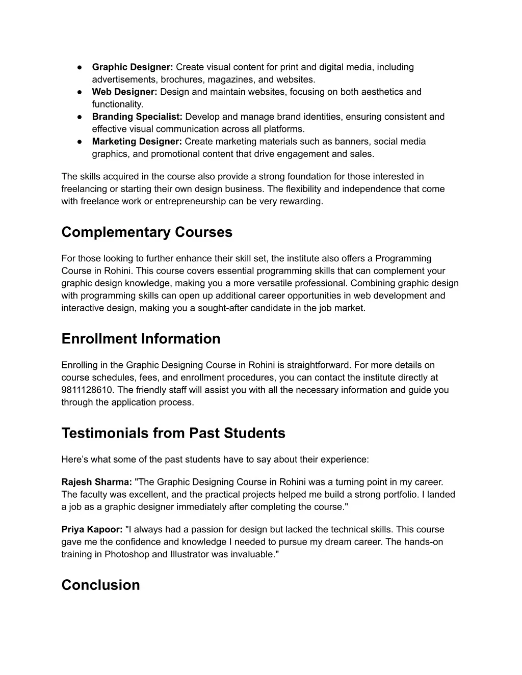 ● Graphic Designer: Create visual content for print and digital media, including advertisements, brochures, magazines, and websites. Web Designer: Design and maintain websites, focusing on both aesthetics and functionality. Branding Specialist: Develop and manage brand identities, ensuring consistent and effective visual communication across all platforms. Marketing Designer: Create marketing materials such as banners, social media graphics, and promotional content that drive engagement and sales. ● ● ● The skills acquired in the course also provide a strong foundation for those interested in freelancing or starting their own design business. The flexibility and independence that come with freelance work or entrepreneurship can be very rewarding. Complementary Courses For those looking to further enhance their skill set, the institute also offers a Programming Course in Rohini. This course covers essential programming skills that can complement your graphic design knowledge, making you a more versatile professional. Combining graphic design with programming skills can open up additional career opportunities in web development and interactive design, making you a sought-after candidate in the job market. Enrollment Information Enrolling in the Graphic Designing Course in Rohini is straightforward. For more details on course schedules, fees, and enrollment procedures, you can contact the institute directly at 9811128610. The friendly staff will assist you with all the necessary information and guide you through the application process. Testimonials from Past Students Here’s what some of the past students have to say about their experience: Rajesh Sharma: "The Graphic Designing Course in Rohini was a turning point in my career. The faculty was excellent, and the practical projects helped me build a strong portfolio. I landed a job as a graphic designer immediately after completing the course." Priya Kapoor: "I always had a passion for design but lacked the technical skills. This course gave me the confidence and knowledge I needed to pursue my dream career. The hands-on training in Photoshop and Illustrator was invaluable." Conclusion
