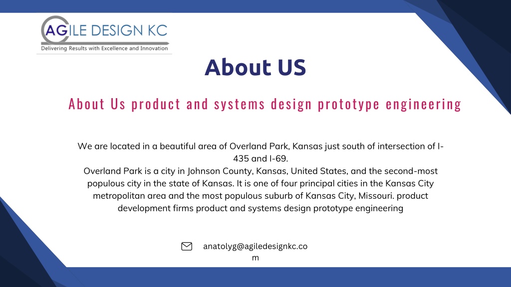 About US About Us product and systems design prototype engineering We are located in a beautiful area of Overland Park, Kansas just south of intersection of I-435 and I-69. Overland Park is a city in Johnson County, Kansas, United States, and the second-most populous city in the state of Kansas. It is one of four principal cities in the Kansas City metropolitan area and the most populous suburb of Kansas City, Missouri. product development firms product and systems design prototype engineering anatolyg@agiledesignkc.com