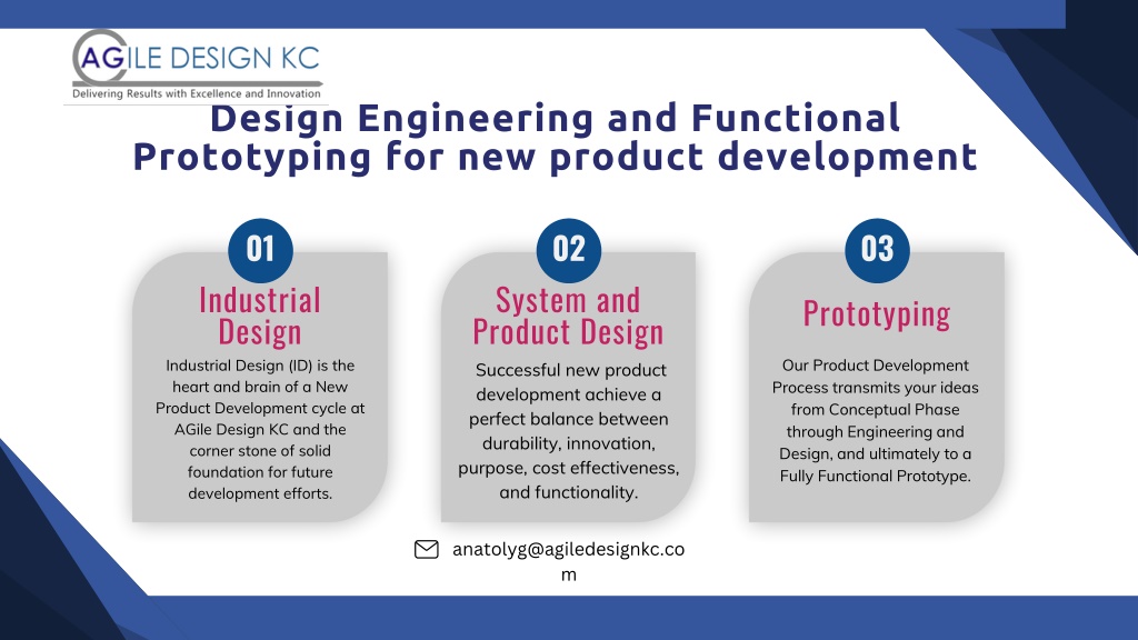 Our Competitive Advantage • 180+ successfully completed projects since 2010 • Strategically Located in KC, Kansas • Established and Experienced • Competitive Rates • Lean Processes • High Customer Satisfaction • Rooted in Creativity and Innovation prototype engineering product and systems design product development firms anatolyg@agiledesignkc.com