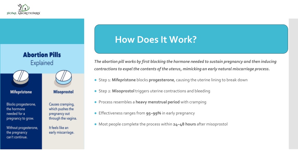 The abortion pill works by first blocking the hormone needed to sustain pregnancy and then inducing contractions to expel the contents of the uterus, mimicking an early natural miscarriage process. • Step 1: Mifepristone blocks progesterone, causing the uterine lining to break down • Step 2: Misoprostol triggers uterine contractions and bleeding • Process resembles a heavy menstrual period with cramping • Effectiveness ranges from 95–99% in early pregnancy • Most people complete the process within 24–48 hours after misoprostol How Does It Work?