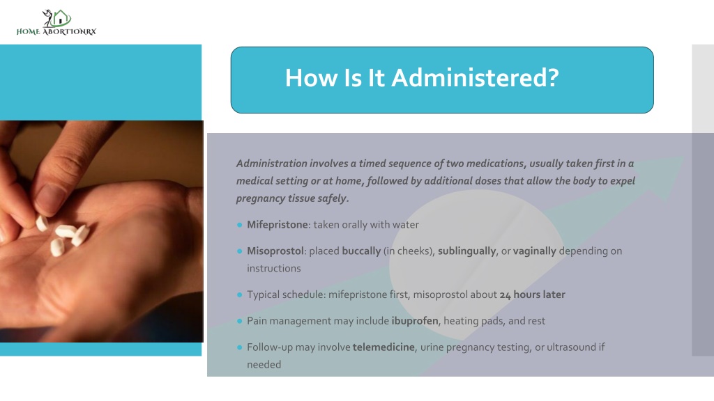 Administration involves a timed sequence of two medications, usually taken first in a medical setting or at home, followed by additional doses that allow the body to expel pregnancy tissue safely. • Mifepristone: taken orally with water • Misoprostol: placed buccally (in cheeks), sublingually, or vaginally depending on instructions • Typical schedule: mifepristone first, misoprostol about 24 hours later • Pain management may include ibuprofen, heating pads, and rest • Follow-up may involve telemedicine, urine pregnancy testing, or ultrasound if needed How Is It Administered?