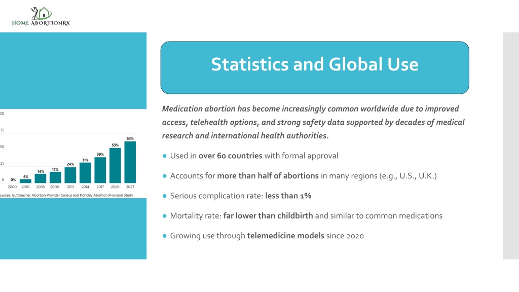 Medication abortion has become increasingly common worldwide due to improved access, telehealth options, and strong safety data supported by decades of medical research and international health authorities. • Used in over 60 countries with formal approval • Accounts for more than half of abortions in many regions (e.g., U.S., U.K.) • Serious complication rate: less than 1% • Mortality rate: far lower than childbirth and similar to common medications • Growing use through telemedicine models since 2020 Statistics and Global Use