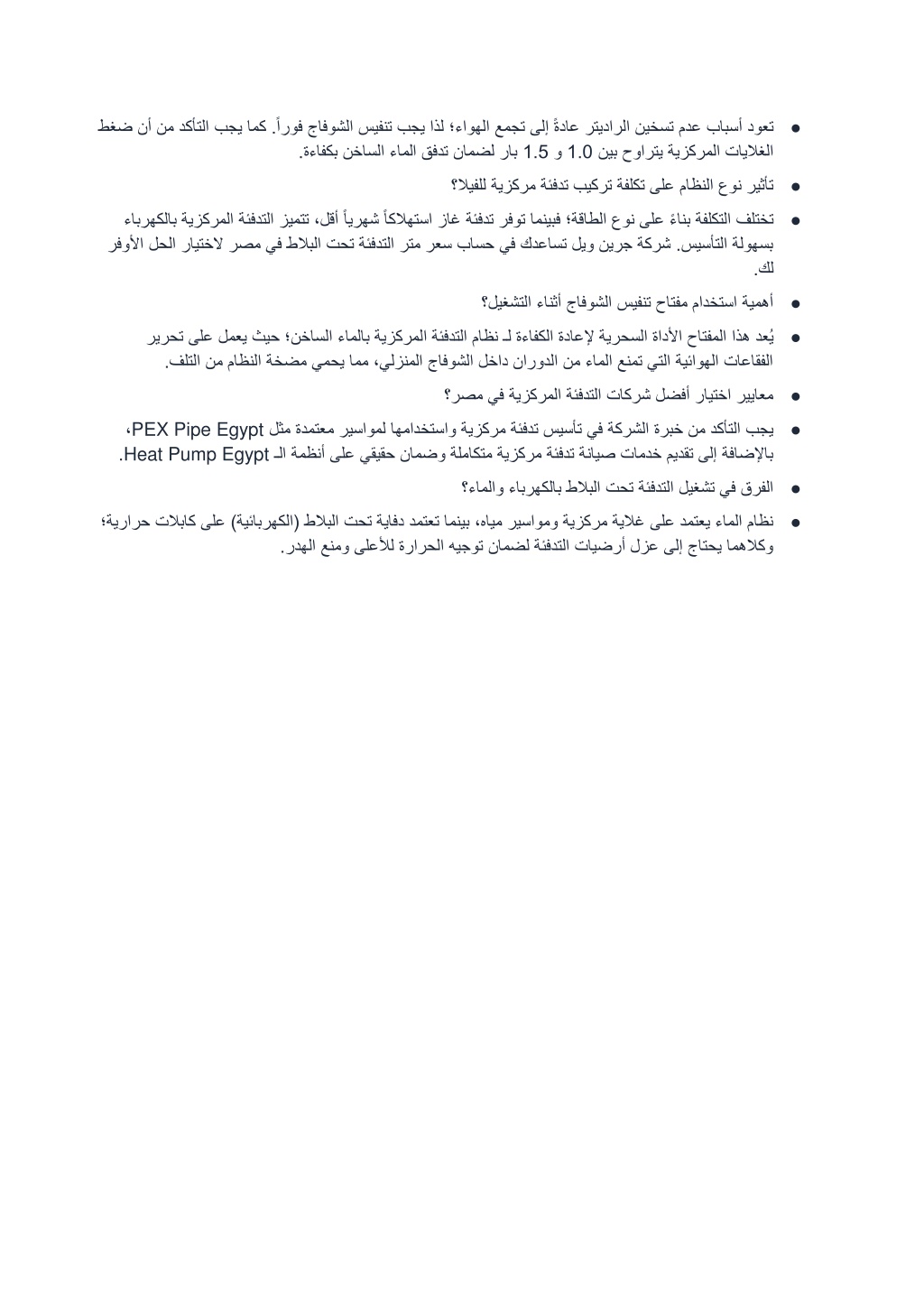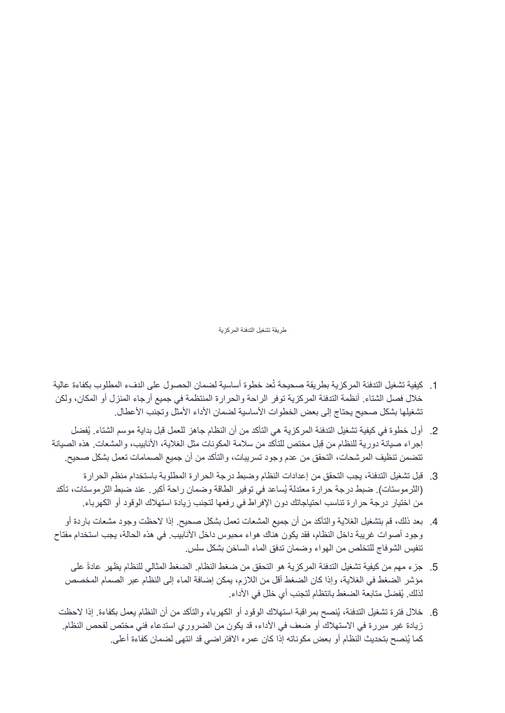 ةيزكرملا ةئفدتلا ليغشت ةقيرط 1 . ةيلاع ةءافكب بولطملا ءفدلا ىلع لوصحلا نامضل ةيساسأ ةوطخ دعُت ةحيحص ةقيرطب ةيزكرملا ةئفدتلا ليغشت ةيفيك نكلو ،ناكملا وأ لزنملا ءاجرأ عيمج يف ةمظتنملا ةرارحلاو ةحارلا رفوت ةيزكرملا ةئفدتلا ةمظنأ .ءاتشلا لصف للاخ .لاطعلأا بنجتو لثملأا ءادلأا نامضل ةيساسلأا تاوطخلا ضعب ىلإ جاتحي حيحص لكشب اهليغشت 2 . لضفُي .ءاتشلا مسوم ةيادب لبق لمعلل زهاج ماظن ةنايصلا هذه .تاعشملاو ،بيبانلأا ،ةيلاغلا لثم تانوكملا ةملاس نم دكأتلل صتخم لبِق نم ماظنلل ةيرود ةنايص ءارجإ .حيحص لكشب لمعت تامامصلا عيمج نأ نم دكأتلاو ،تابيرست دوجو مدع نم ققحتلا ،تاحشرملا فيظنت نمضتت لا نأ نم دكأتلا يه ةيزكرملا ةئفدتلا ليغشت ةيفيك يف ةوطخ لوأ 3 . ةرارحلا مظنم مادختساب ةبولطملا ةرارحلا ةجرد طبضو ماظنلا تادادعإ نم ققحتلا بجي ،ةئفدتلا دكأت ،تاتسومرثلا طبض دنع .ربكأ ةحار نامضو ةقاطلا ريفوت يف دعاسُي ةلدتعم ةرارح ةجرد طبض .)تاتسومرثلا( ايز بنجتل اهعفر يف طارفلإا نود كتاجايتحا بسانت ةرارح ةجرد رايتخا نم .ءابرهكلا وأ دوقولا كلاهتسا ةد ليغشت لبق 4 . وأ ةدراب تاعشم دوجو تظحلا اذإ .حيحص لكشب لمعت تاعشملا عيمج نأ نم دكأتلاو ةيلاغلا ليغشتب مق ،كلذ دعب حاتفم مادختسا بجي ،ةلاحلا هذه يف .بيبانلأا لخاد سوبحم ءاوه كانه نوكي دقف ،ماظنلا لخاد ةبيرغ تاوصأ دوجو .سلس لكشب نخاسلا ءاملا قفدت نامضو ءاوهلا ن م صلختلل جافوشلا سيفنت 5 . ىلع ًةداع رهظي ماظنلل يلاثملا طغضلا .ماظنلا طغض نم ققحتلا وه ةيزكرملا ةئفدتلا ليغشت ةيفيك نم مهم ءزج صصخملا مامصلا ربع ماظنلا ىلإ ءاملا ةفاضإ نكمي ،مزلالا نم لقأ طغضلا ناك اذإو ،ةيلاغلا يف طغضلا رشؤم .ءادلأا يف للخ يأ بنجتل ماظتناب طغضلا ةعبات م لضفُي .كلذل 6 . تظحلا اذإ .ةءافكب لمعي ماظنلا نأ نم دكأتلاو ءابرهكلا وأ دوقولا كلاهتسا ةبقارمب حصنُي ،ةئفدتلا ليغشت ةرتف للاخ .ماظنلا صحفل صتخم ينف ءاعدتسا يرورضلا نم نوكي دق ،ءادلأا يف فعض وأ كلاهتسلاا يف ةرربم ريغ ةدايز .ىلعأ ةءافك نامضل ىهتنا دق يضارتفلاا هرمع ناك اذإ هتانوكم ضعب وأ ماظنلا ثيدحتب حصن ُي امك