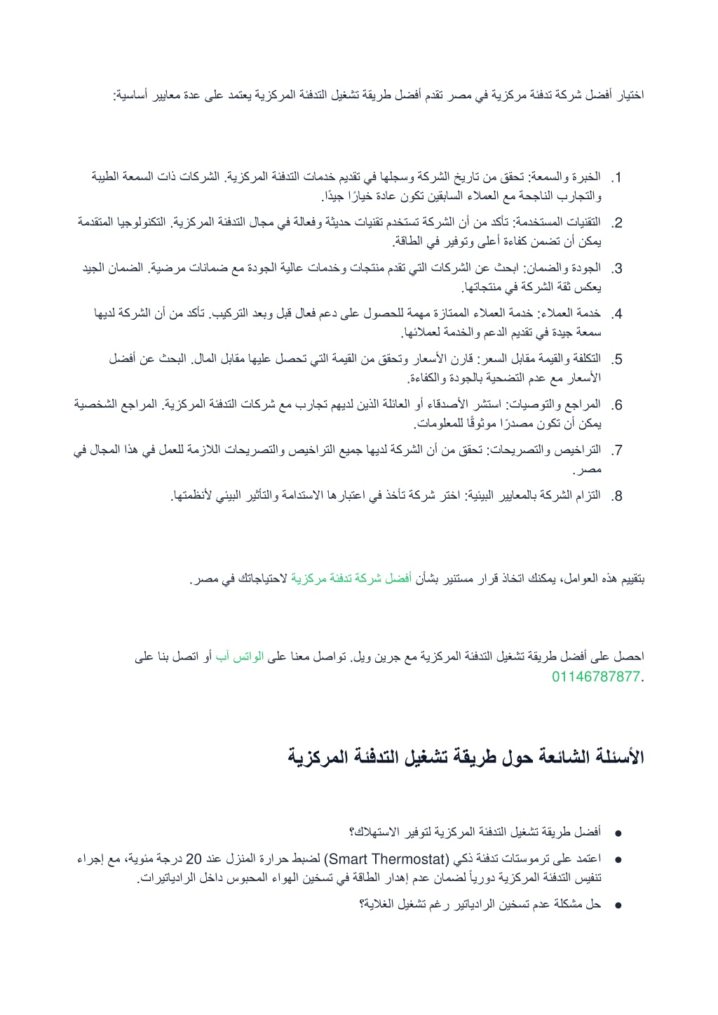 :ةيساسأ ريياعم ةدع ىلع دمتعي ةيزكرملا ةئفدتلا ليغشت ةقيرط لضفأ مدقت رصم يف ةيزكرم ةئفدت ةكرش لضفأ رايتخا 1 . ةبيطلا ةعمسلا تاذ تاكرشلا .ةيزكرملا ةئفدتلا تامدخ ميدقت يف اهلجسو ةكرشلا خيرات نم ققحت :ةعمسلاو ةربخلا .اًديج اًرايخ ةداع نوكت نيقباسلا ءلامعلا عم ةحجانلا براجتلاو 2 . ةمدقتملا ايجولونكتلا .ةيزكرملا ةئفدتلا لاجم يف ةلاعفو ةثيدح تاينقت مدختست ةكرشلا نأ نم دكأت :ةمدختسملا تاينقتلا .ةقاطلا يف ريفوتو ىلعأ ةءافك نمضت نأ نكمي 3 . ديجلا نامضلا .ةيضرم تانامض عم ةدوجلا ةيل اع تامدخو تاجتنم مدقت يتلا تاكرشلا نع ثحبا :نامضلاو ةدوجلا .اهتاجتنم يف ةكرشلا ةقث سكعي 4 . اهيدل ةكرشلا نأ نم دكأت .بيكرتلا دعبو لبق لاعف معد ىلع لوصحلل ةمهم ةزاتمملا ءلامعلا ةمدخ :ءلامعلا ةمدخ .اهئلامعل ةمدخلاو معدلا ميدقت يف ةديج ةعمس 5 . لضفأ نع ثحبلا .لاملا لباقم اهيلع لصحت يتلا ةميقلا نم ققحتو ر اعسلأا نراق :رعسلا لباقم ةميقلاو ةفلكتلا .ةءافكلاو ةدوجلاب ةيحضتلا مدع عم راعسلأا 6 . ةيصخشلا عجارملا .ةيزكرملا ةئفدتلا تاكرش عم براجت مهيدل نيذلا ةلئاعلا وأ ءاقدصلأا رشتسا :تايصوتلاو عجارملا .تامولعملل اًقوثوم اًردصم نوكت نأ نكمي 7 . يف لاجملا اذه يف لمعلل ةمزلالا تاحيرصتلاو صيخارتلا عيمج اهيدل ةكرشلا نأ نم ققحت :تاحيرصتلاو صيخارتلا .رصم 8 . .اهتمظنلأ يئيبلا ريثأتلاو ةمادتسلاا اهرابتعا يف ذخأت ةكرش رتخا :ةيئيبلا ريياعملاب ةكرشلا مازتلا .رصم يف كتاجايتحلا ةيزكرم ةئفدت ةكرش لضفأ نأشب رينتسم رارق ذاختا كنكمي ،لماوعلا هذه مييقتب ىلع انب لصتا وأ بآ ىلع انعم لصاوت .ليو نيرج عم ةيزكرملا ةئفدتلا ليغشت ةقيرط لضفأ ىلع لصحا ستاولا 01146787877. ةيزكرملا ةئفدتلا ليغشت ةقيرط لوح ةعئاشلا ةلئسلأا ؟كلاهتسلاا ريفوتل ةيزكرملا ةئفدتلا ليغشت ةقيرط لضفأ ● Smart Thermostat ءارجإ عم ،ةيوئم ةجرد 20 دنع لزنملا ةرارح طبضل ) ( يكذ ةئفدت تاتسومرت ىلع دمتعا ● .تاريتايدارلا لخاد سوبحملا ءاوهلا نيخست يف ةقاطلا رادهإ مدع نامضل ًايرود ةيزكرملا ةئفدتلا سيفنت ؟ةيلاغلا ليغشت مغر ريتايدارلا نيخست مدع ةلكشم لح ●