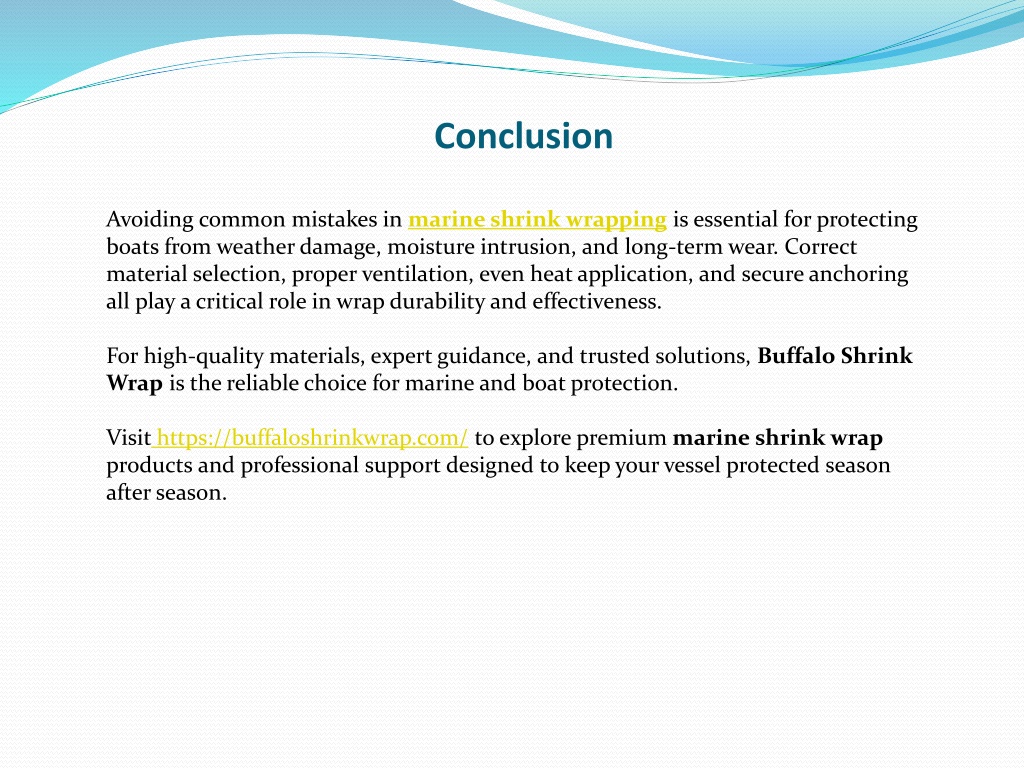Conclusion Avoiding common mistakes in marine shrink wrapping is essential for protecting boats from weather damage, moisture intrusion, and long-term wear. Correct material selection, proper ventilation, even heat application, and secure anchoring all play a critical role in wrap durability and effectiveness. For high-quality materials, expert guidance, and trusted solutions, Buffalo Shrink Wrap is the reliable choice for marine and boat protection.Visithttps://buffaloshrinkwrap.com/ to explore premium marine shrink wrap products and professional support designed to keep your vessel protected season after season.