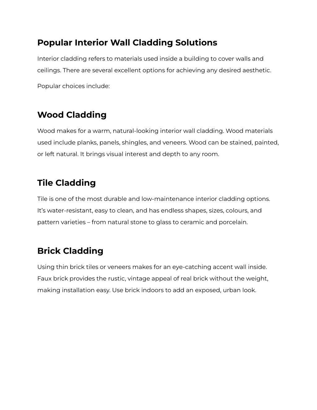 Popular Interior Wall Cladding Solutions Interior cladding refers to materials used inside a building to cover walls and ceilings. There are several excellent options for achieving any desired aesthetic. Popular choices include: Wood Cladding Wood makes for a warm, natural-looking interior wall cladding. Wood materials used include planks, panels, shingles, and veneers. Wood can be stained, painted, or left natural. It brings visual interest and depth to any room. Tile Cladding Tile is one of the most durable and low-maintenance interior cladding options. It’s water-resistant, easy to clean, and has endless shapes, sizes, colours, and pattern varieties – from natural stone to glass to ceramic and porcelain. Brick Cladding Using thin brick tiles or veneers makes for an eye-catching accent wall inside. Faux brick provides the rustic, vintage appeal of real brick without the weight, making installation easy. Use brick indoors to add an exposed, urban look.