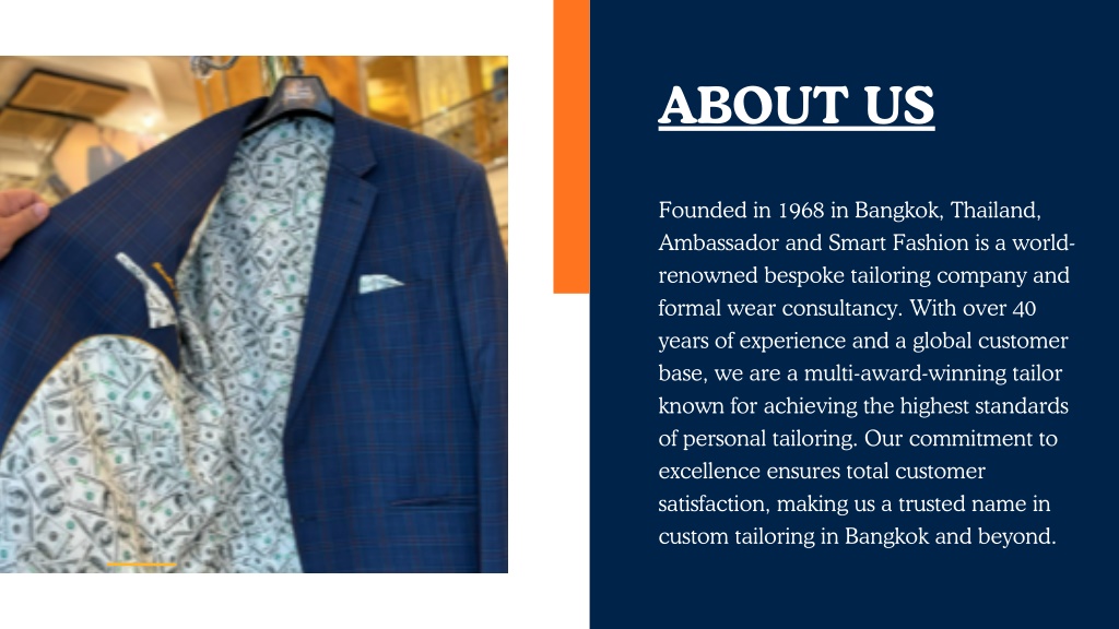 ABOUT US Founded in 1968 in Bangkok, Thailand, Ambassador and Smart Fashion is a world- renowned bespoke tailoring company and formal wear consultancy. With over 40 years of experience and a global customer base, we are a multi-award-winning tailor known for achieving the highest standards of personal tailoring. Our commitment to excellence ensures total customer satisfaction, making us a trusted name in custom tailoring in Bangkok and beyond.
