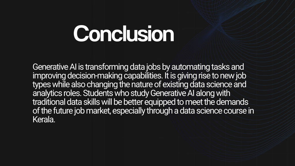 Conclusion Generative AI is transforming data jobs by automating tasks and improving decision-making capabilities. It is giving rise to new job types while also changing the nature of existing data science and analytics roles. Students who study Generative AI along with traditional data skills will be better equipped to meet the demands of the future job market, especially through a data science course in Kerala.