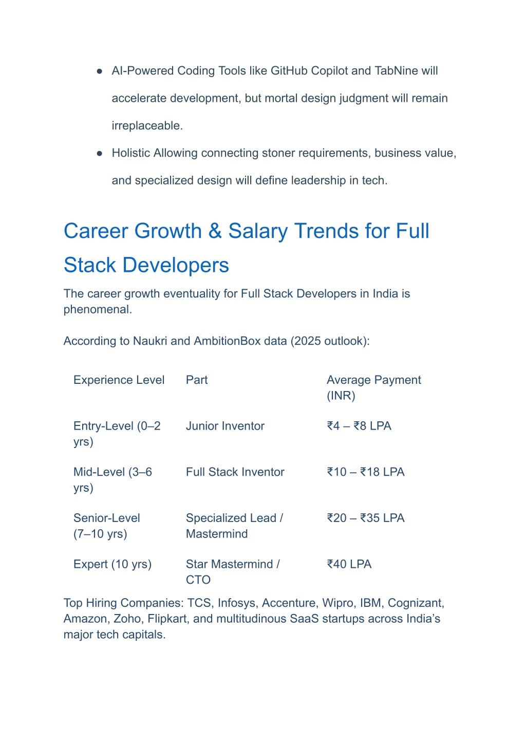 ● AI-Powered Coding Tools like GitHub Copilot and TabNine will accelerate development, but mortal design judgment will remain irreplaceable. ● Holistic Allowing connecting stoner requirements, business value, and specialized design will define leadership in tech. Career Growth & Salary Trends for Full Stack Developers The career growth eventuality for Full Stack Developers in India is phenomenal. According to Naukri and AmbitionBox data (2025 outlook): Experience Level Part Average Payment (INR) Entry-Level (0–2 yrs) Junior Inventor ₹4 – ₹8 LPA Mid-Level (3–6 yrs) Full Stack Inventor ₹10 – ₹18 LPA Senior-Level (7–10 yrs) Specialized Lead / Mastermind ₹20 – ₹35 LPA Expert (10 yrs) Star Mastermind / CTO ₹40 LPA Top Hiring Companies: TCS, Infosys, Accenture, Wipro, IBM, Cognizant, Amazon, Zoho, Flipkart, and multitudinous SaaS startups across India’s major tech capitals.