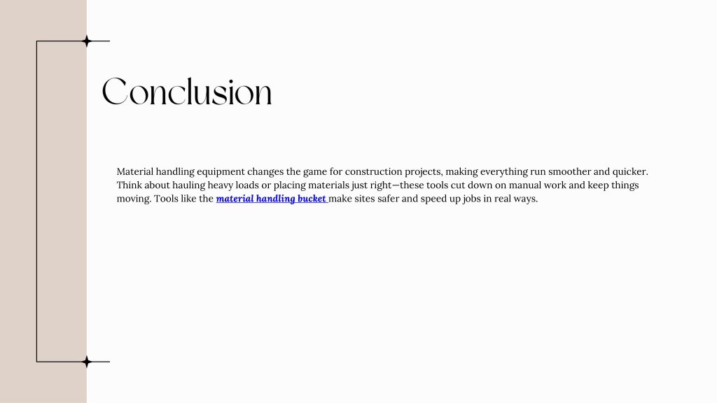 8. Conclusion • Material handling equipment changes the game for construction projects, making everything run smoother and quicker. Think about hauling heavy loads or placing materials just right—these tools cut down on manual work and keep things moving. Tools like the material handling bucketmake sites safer and speed up jobs in real ways.