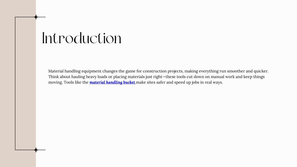 2. Introduction • Material handling equipment changes the game for construction projects, making everything run smoother and quicker. Think about hauling heavy loads or placing materials just right—these tools cut down on manual work and keep things moving. Tools like the material handling bucketmake sites safer and speed up jobs in real ways.