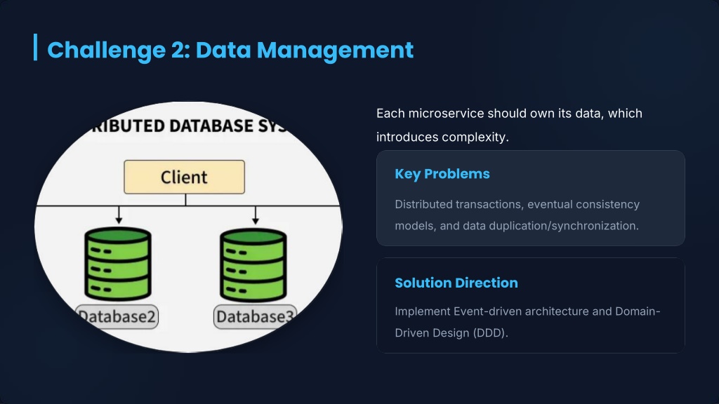 Challenge 2: Data Management Each microservice should own its data, which introduces complexity. Key Problems Distributed transactions, eventual consistency models, and data duplication/synchronization. Solution Direction Implement Event-driven architecture and Domain-Driven Design (DDD).