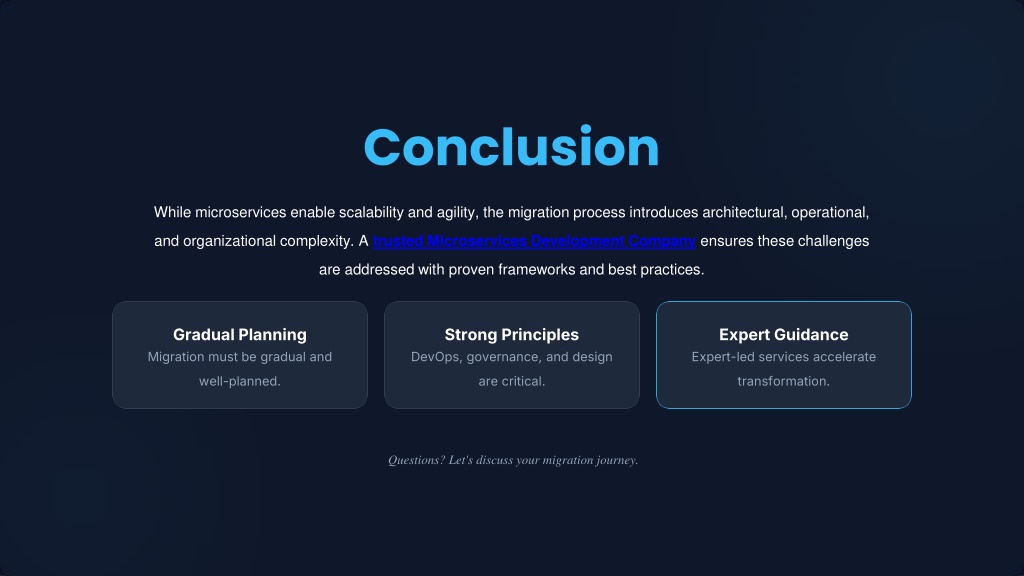 Conclusion While microservices enable scalability and agility, the migration process introduces architectural, operational, and organizational complexity. A trustedMicroservices Development Company ensures these challenges are addressed with proven frameworks and best practices. Gradual Planning Strong Principles Expert Guidance Migration must be gradual and well-planned. DevOps, governance, and design are critical. Expert-led services accelerate transformation. Questions? Let's discuss your migration journey.