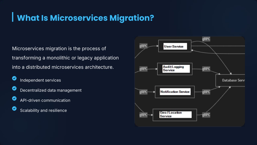 What Is Microservices Migration? Microservices migration is the process of transforming a monolithic or legacy application into a distributed microservices architecture. Independent services Decentralized data management API-driven communication Scalability and resilience