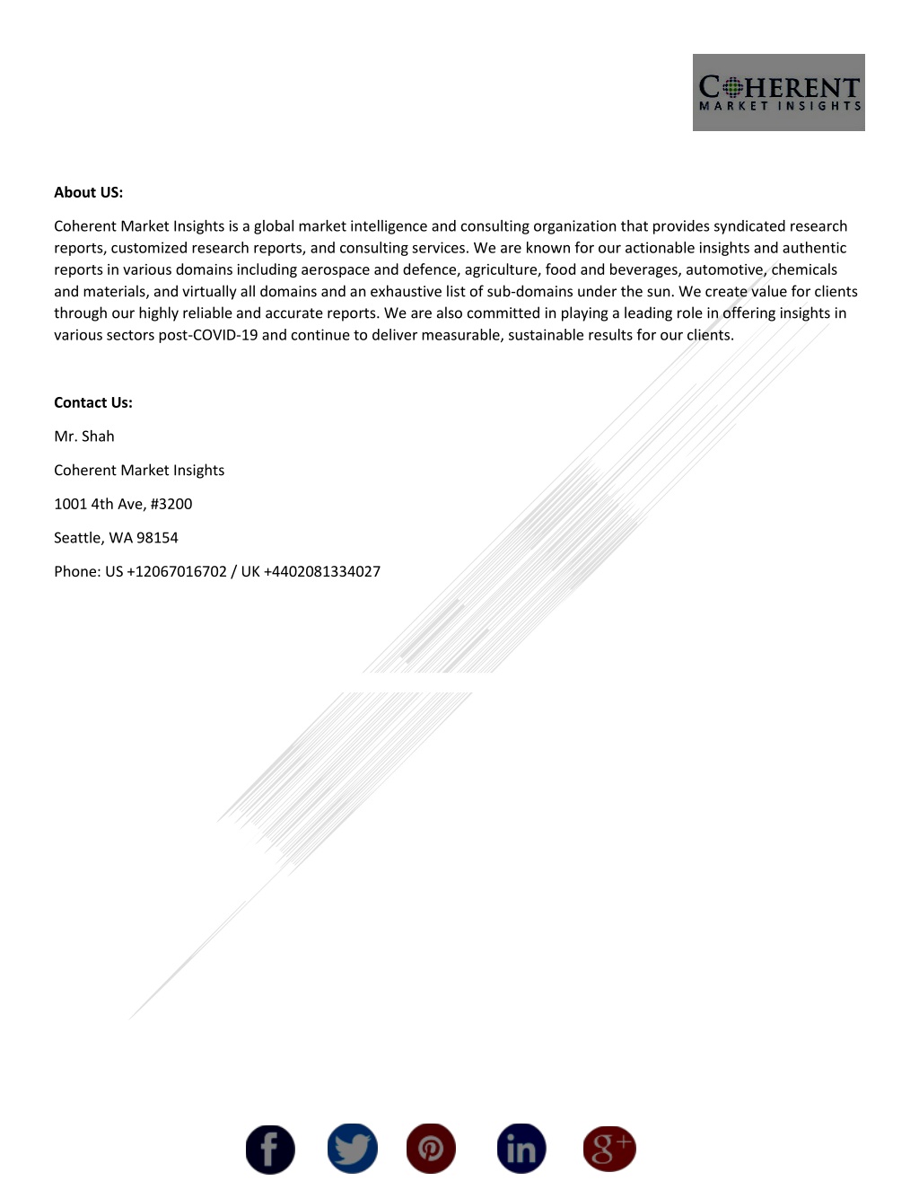 About US: Coherent Market Insights is a global market intelligence and consulting organization that provides syndicated research reports, customized research reports, and consulting services. We are known for our actionable insights and authentic reports in various domains including aerospace and defence, agriculture, food and beverages, automotive, chemicals and materials, and virtually all domains and an exhaustive list of sub-domains under the sun. We create value for clients through our highly reliable and accurate reports. We are also committed in playing a leading role in offering insights in various sectors post-COVID-19 and continue to deliver measurable, sustainable results for our clients. Contact Us: Mr. Shah Coherent Market Insights 1001 4th Ave, #3200 Seattle, WA 98154 Phone: US +12067016702 / UK +4402081334027