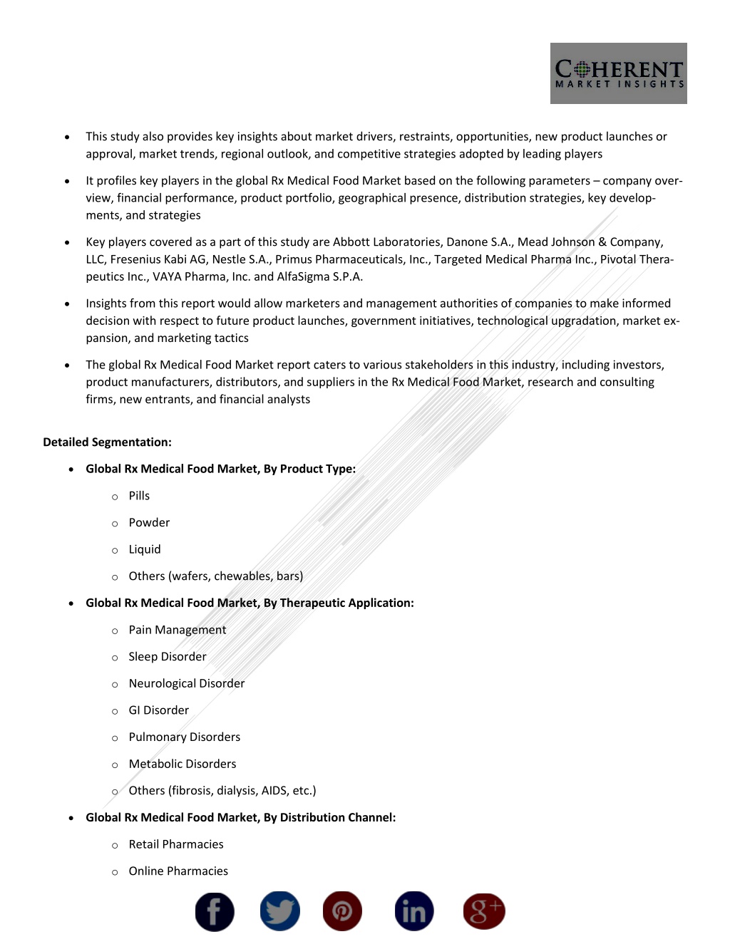 This study also provides key insights about market drivers, restraints, opportunities, new product launches or approval, market trends, regional outlook, and competitive strategies adopted by leading players It profiles key players in the global Rx Medical Food Market based on the following parameters – company over- view, financial performance, product portfolio, geographical presence, distribution strategies, key develop- ments, and strategies Key players covered as a part of this study are Abbott Laboratories, Danone S.A., Mead Johnson & Company, LLC, Fresenius Kabi AG, Nestle S.A., Primus Pharmaceuticals, Inc., Targeted Medical Pharma Inc., Pivotal Thera- peutics Inc., VAYA Pharma, Inc. and AlfaSigma S.P.A. Insights from this report would allow marketers and management authorities of companies to make informed decision with respect to future product launches, government initiatives, technological upgradation, market ex- pansion, and marketing tactics The global Rx Medical Food Market report caters to various stakeholders in this industry, including investors, product manufacturers, distributors, and suppliers in the Rx Medical Food Market, research and consulting firms, new entrants, and financial analysts Detailed Segmentation: Global Rx Medical Food Market, By Product Type: oPills oPowder oLiquid oOthers (wafers, chewables, bars) Global Rx Medical Food Market, By Therapeutic Application: oPain Management oSleep Disorder oNeurological Disorder oGI Disorder oPulmonary Disorders oMetabolic Disorders oOthers (fibrosis, dialysis, AIDS, etc.) Global Rx Medical Food Market, By Distribution Channel: oRetail Pharmacies oOnline Pharmacies