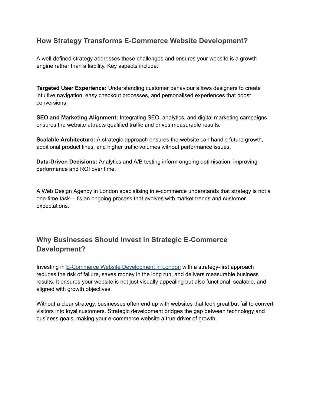 How Strategy Transforms E-Commerce Website Development? A well-defined strategy addresses these challenges and ensures your website is a growth engine rather than a liability. Key aspects include: Targeted User Experience: Understanding customer behaviour allows designers to create intuitive navigation, easy checkout processes, and personalised experiences that boost conversions. SEO and Marketing Alignment: Integrating SEO, analytics, and digital marketing campaigns ensures the website attracts qualified traffic and drives measurable results. Scalable Architecture: A strategic approach ensures the website can handle future growth, additional product lines, and higher traffic volumes without performance issues. Data-Driven Decisions: Analytics and A/B testing inform ongoing optimisation, improving performance and ROI over time. A Web Design Agency in London specialising in e-commerce understands that strategy is not a one-time task—it’s an ongoing process that evolves with market trends and customer expectations. Why Businesses Should Invest in Strategic E-Commerce Development? Investing in E-Commerce Website Development in London with a strategy-first approach reduces the risk of failure, saves money in the long run, and delivers measurable business results. It ensures your website is not just visually appealing but also functional, scalable, and aligned with growth objectives. Without a clear strategy, businesses often end up with websites that look great but fail to convert visitors into loyal customers. Strategic development bridges the gap between technology and business goals, making your e-commerce website a true driver of growth.