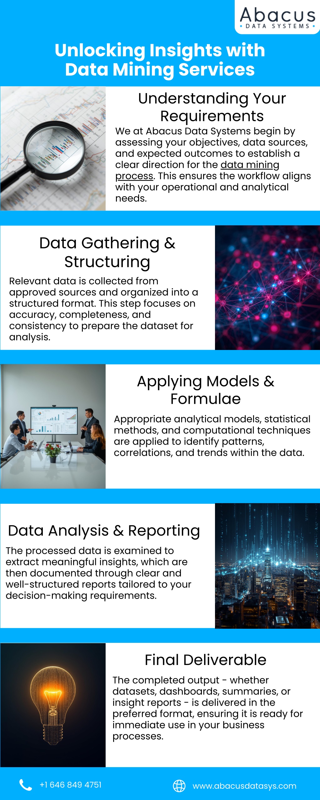 1. Unlocking Insights with Data Mining Services Understanding Your Requirements We at Abacus Data Systems begin by assessing your objectives, data sources, and expected outcomes to establish a clear direction for the data mining process. This ensures the workflow aligns with your operational and analytical needs. Data Gathering & Structuring Relevant data is collected from approved sources and organized into a structured format. This step focuses on accuracy, completeness, and consistency to prepare the dataset for analysis. Applying Models & Formulae Appropriate analytical models, statistical methods, and computational techniques are applied to identify patterns, correlations, and trends within the data. Data Analysis & Reporting The processed data is examined to extract meaningful insights, which are then documented through clear and well-structured reports tailored to your decision-making requirements. Final Deliverable The completed output - whether datasets, dashboards, summaries, or insight reports - is delivered in the preferred format, ensuring it is ready for immediate use in your business processes. +1 646 849 4751 www.abacusdatasys.com