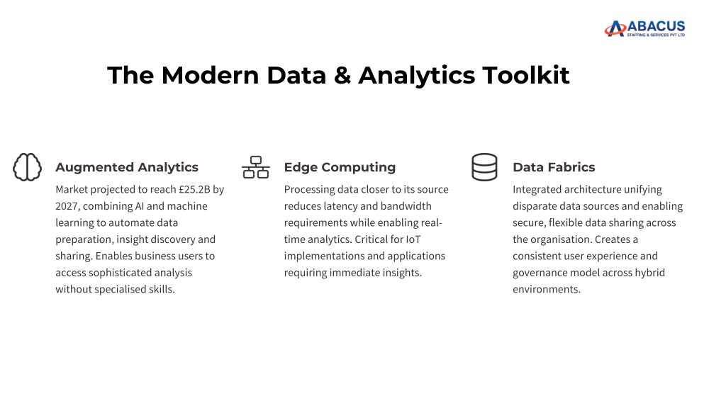 The Modern Data & Analytics Toolkit Augmented Analytics Edge Computing Data Fabrics Market projected to reach £25.2B by 2027, combining AI and machine learning to automate data preparation, insight discovery and sharing. Enables business users to access sophisticated analysis without specialised skills. Processing data closer to its source reduces latency and bandwidth requirements while enabling real- time analytics. Critical for IoT implementations and applications requiring immediate insights. Integrated architecture unifying disparate data sources and enabling secure, flexible data sharing across the organisation. Creates a consistent user experience and governance model across hybrid environments.