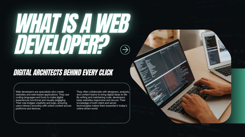 DIGITAL ARCHITECTS BEHIND EVERY CLICK Web developers are specialists who create websites and web-based applications. They use coding languages and tools to make digital experiences functional and visually engaging. Their role bridges creativity and logic, ensuring users interact smoothly with online content across platforms and devices. They often collaborate with designers, analysts, and content teams to bring digital ideas to life. By writing and maintaining code, developers keep websites responsive and secure. Their knowledge of both client and server technologies makes them essential in today’s online-driven world.