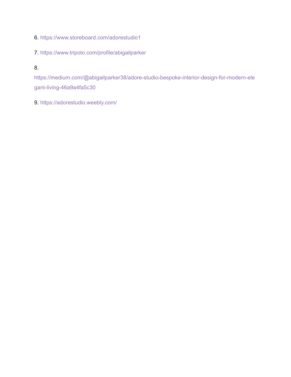 6. https://www.storeboard.com/adorestudio1 7. https://www.tripoto.com/profile/abigailparker 8. https://medium.com/@abigailparker38/adore-studio-bespoke-interior-design-for-modern-ele gant-living-46a9a4fa5c30 9. https://adorestudio.weebly.com/