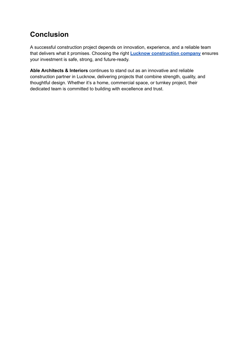 4. Conclusion A successful construction project depends on innovation, experience, and a reliable team that delivers what it promises. Choosing the right Lucknow construction company ensures your investment is safe, strong, and future-ready. Able Architects & Interiors continues to stand out as an innovative and reliable construction partner in Lucknow, delivering projects that combine strength, quality, and thoughtful design. Whether it’s a home, commercial space, or turnkey project, their dedicated team is committed to building with excellence and trust.