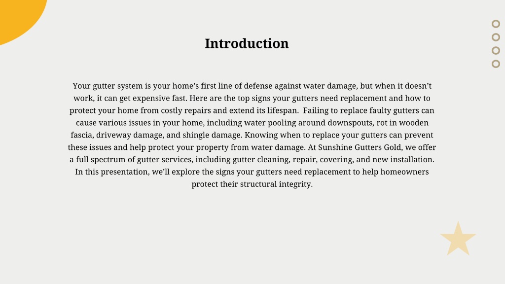Introduction Your gutter system is your home’s first line of defense against water damage, but when it doesn’t work, it can get expensive fast. Here are the top signs your gutters need replacement and how to protect your home from costly repairs and extend its lifespan. Failing to replace faulty gutters can cause various issues in your home, including water pooling around downspouts, rot in wooden fascia, driveway damage, and shingle damage. Knowing when to replace your gutters can prevent these issues and help protect your property from water damage. At Sunshine Gutters Gold, we offer a full spectrum of gutter services, including gutter cleaning, repair, covering, and new installation. In this presentation, we’ll explore the signs your gutters need replacement to help homeowners protect their structural integrity.