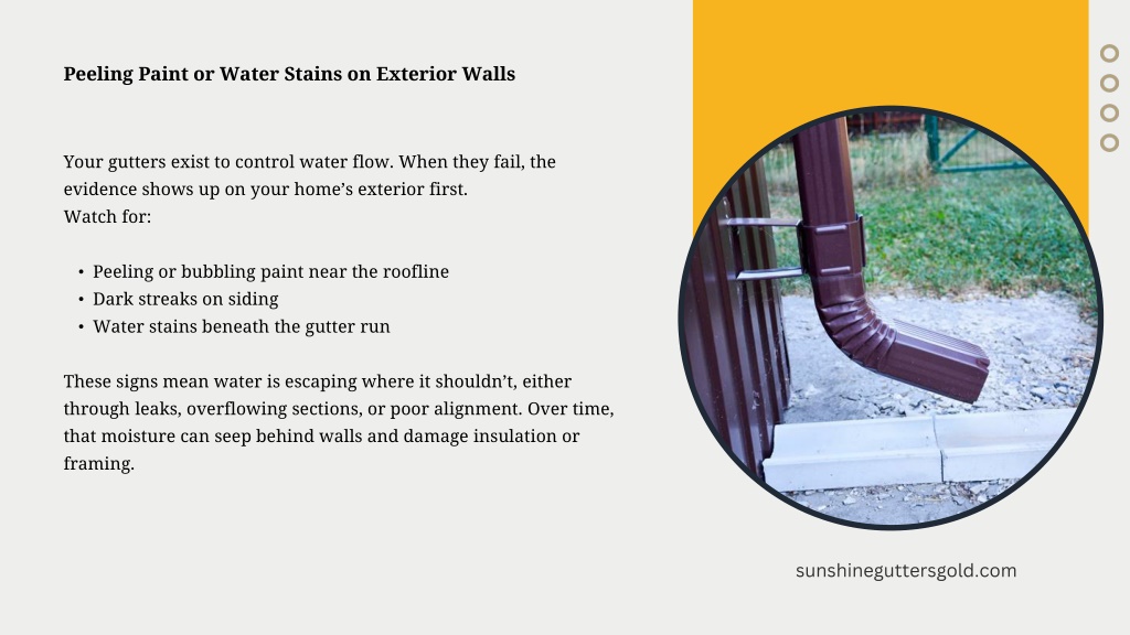 Peeling Paint or Water Stains on Exterior Walls • Your gutters exist to control water flow. When they fail, the evidence shows up on your home’s exterior first. • Watch for: • Peeling or bubbling paint near the roofline • Dark streaks on siding • Water stains beneath the gutter run • These signs mean water is escaping where it shouldn’t, either through leaks, overflowing sections, or poor alignment. Over time, that moisture can seep behind walls and damage insulation or framing. sunshineguttersgold.com