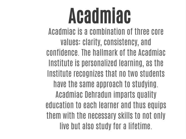 Acadmiac Acadmiac is a combination of three core values: clarity, consistency, and confidence. The hallmark of the Acadmiac Institute is personalized learning, as the Institute recognizes that no two students have the same approach to studying. Acadmiac Dehradun imparts quality education to each learner and thus equips them with the necessary skills to not only live but also study for a lifetime.