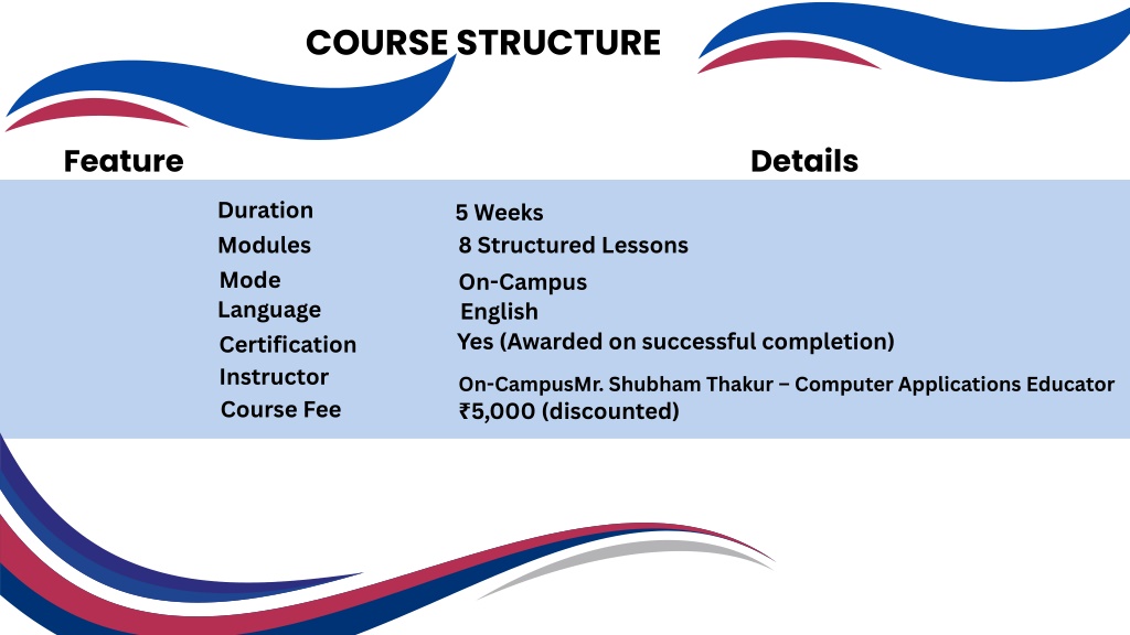 COURSE STRUCTURE Feature Details Duration Modules Mode Language Certification Instructor Course Fee 5 Weeks 8 Structured Lessons On-Campus English Yes (Awarded on successful completion) On-CampusMr. Shubham Thakur – Computer Applications Educator ₹5,000 (discounted)