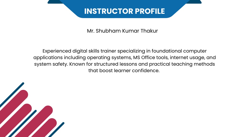 INSTRUCTOR PROFILE Mr. Shubham Kumar Thakur Experienced digital skills trainer specializing in foundational computer applications including operating systems, MS Office tools, internet usage, and system safety. Known for structured lessons and practical teaching methods that boost learner confidence.