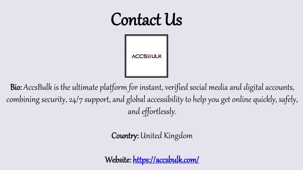 Contact Us Bio: AccsBulk is the ultimate platform for instant, verified social media and digital accounts, combining security, 24/7 support, and global accessibility to help you get online quickly, safely, and effortlessly. Country: United Kingdom Website: https://accsbulk.com/