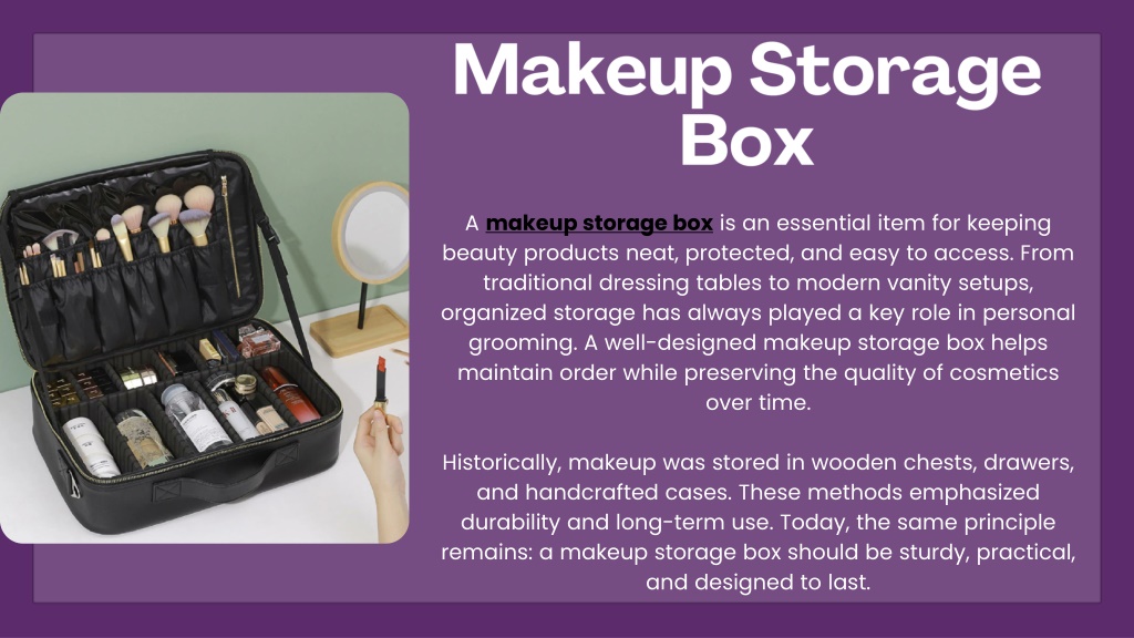 Makeup Storage Box • A makeup storage boxis an essential item for keeping beauty products neat, protected, and easy to access. From traditional dressing tables to modern vanity setups, organized storage has always played a key role in personal grooming. A well-designed makeup storage box helps maintain order while preserving the quality of cosmetics over time. • Historically, makeup was stored in wooden chests, drawers, and handcrafted cases. These methods emphasized durability and long-term use. Today, the same principle remains: a makeup storage box should be sturdy, practical, and designed to last.