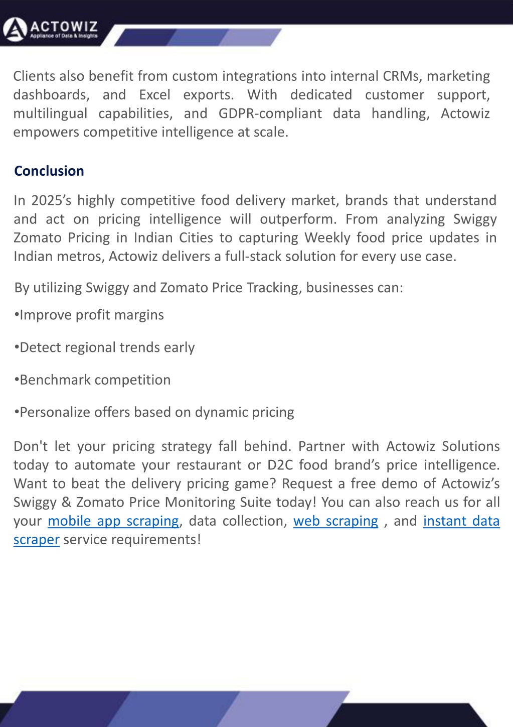 Actowiz Solutions builds global multi-platform scraping systems for enterprise price intelligence, enabling real-time competitive and market insights. In the hyper-competitive world of retail and e-commerce, price intelligence is the lifeblood of profitable decision-making. Global brands face constant pressure to monitor prices across multiple markets, tracku00a0competitor promotions, and ensure compliance with pricing regulations.