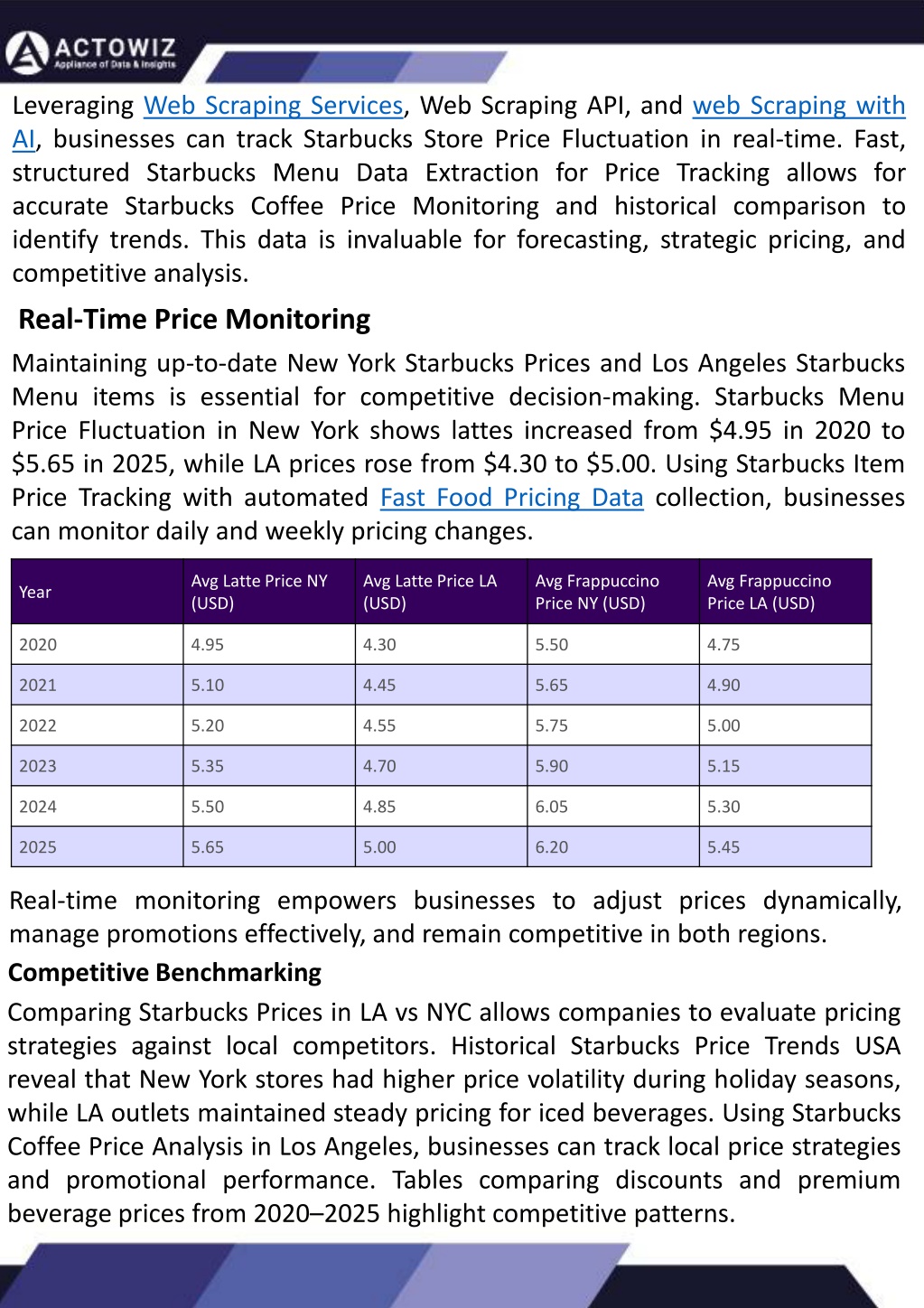 Track Starbucks Menu Price Fluctuation in New York and LA. Analyze latte, frappuccino, and cappuccino prices from 2020u20132025 for smarter pricing and promotions. Leveragingu00a0Web Scraping Services, Web Scraping API, andu00a0web Scraping with AI, businesses can track Starbucks Store Price Fluctuation in real-time.