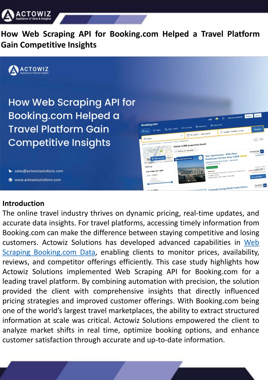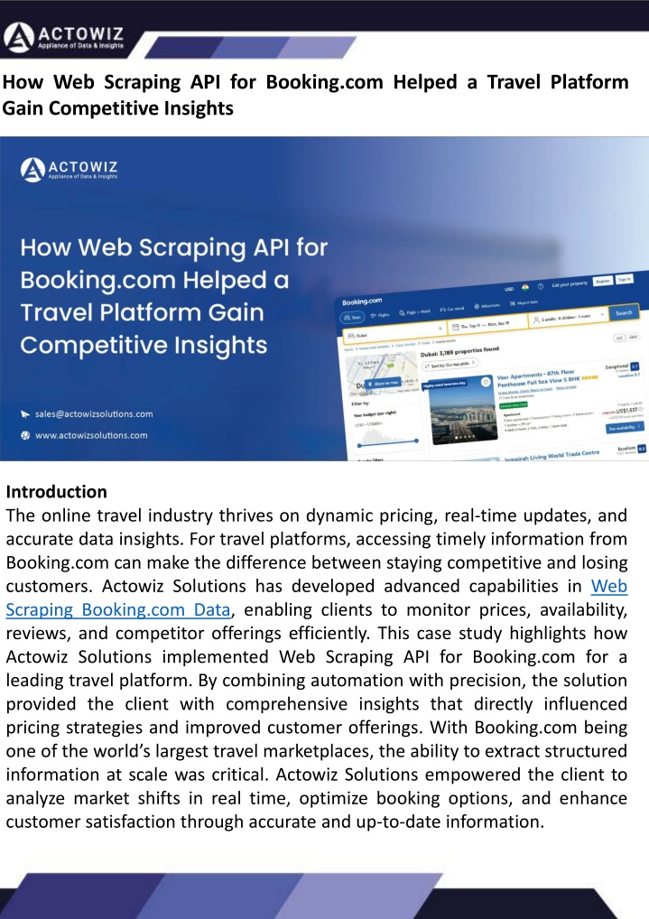 See how Web Scraping API for Booking.com helped a travel platform track prices, monitor availability, and gain competitive insights for smarter decisions. This case study highlights how Actowiz Solutions implemented Web Scraping API for Booking.com for a leading travel platform. By combining automation with precision, the solution provided the client with comprehensive insights that directly influenced pricing strategies and improved customer offerings.