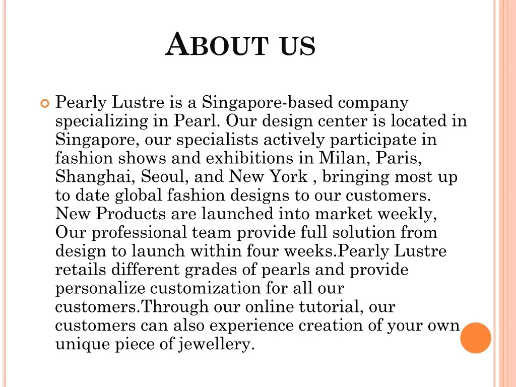 About us • Pearly Lustre is a Singapore-based company specializing in Pearl. Our design center is located in Singapore, our specialists actively participate in fashion shows and exhibitions in Milan, Paris, Shanghai, Seoul, and New York , bringing most up to date global fashion designs to our customers. New Products are launched into market weekly, Our professional team provide full solution from design to launch within four weeks.PearlyLustre retails different grades of pearls and provide personalize customization for all our customers.Through our online tutorial, our customers can also experience creation of your own unique piece of jewellery.