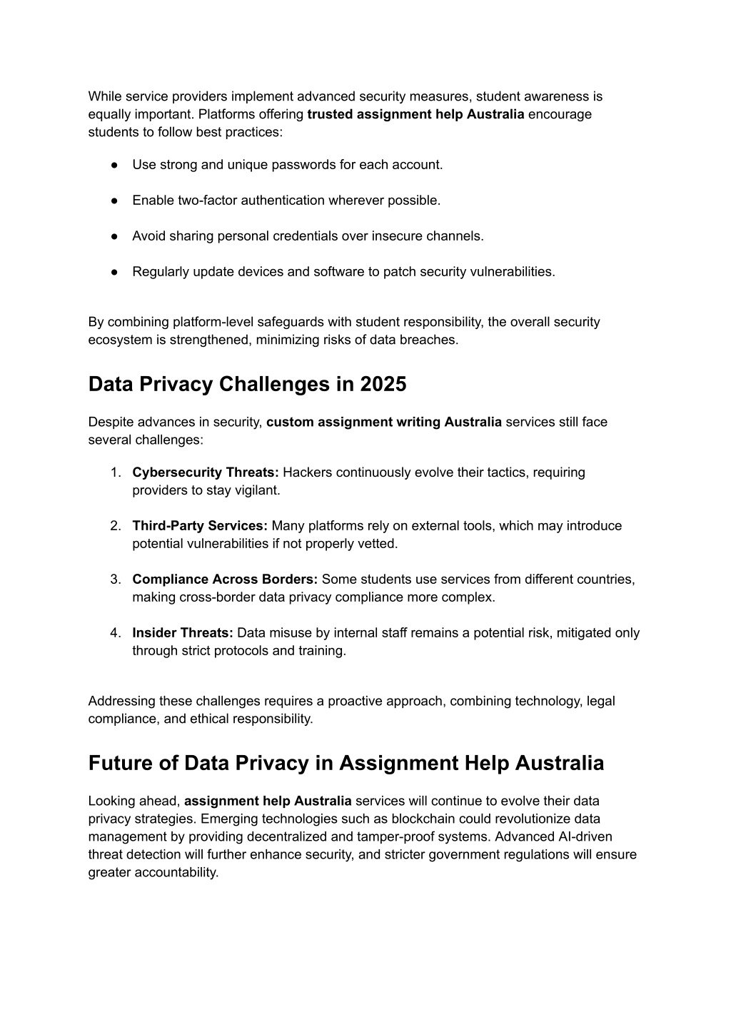 While service providers implement advanced security measures, student awareness is equally important. Platforms offering trusted assignment help Australia encourage students to follow best practices: ● Use strong and unique passwords for each account. ● Enable two-factor authentication wherever possible. ● Avoid sharing personal credentials over insecure channels. ● Regularly update devices and software to patch security vulnerabilities. By combining platform-level safeguards with student responsibility, the overall security ecosystem is strengthened, minimizing risks of data breaches. Data Privacy Challenges in 2025 Despite advances in security, custom assignment writing Australia services still face several challenges: 1. Cybersecurity Threats: Hackers continuously evolve their tactics, requiring providers to stay vigilant. 2. Third-Party Services: Many platforms rely on external tools, which may introduce potential vulnerabilities if not properly vetted. 3. Compliance Across Borders: Some students use services from different countries, making cross-border data privacy compliance more complex. 4. Insider Threats: Data misuse by internal staff remains a potential risk, mitigated only through strict protocols and training. Addressing these challenges requires a proactive approach, combining technology, legal compliance, and ethical responsibility. Future of Data Privacy in Assignment Help Australia Looking ahead, assignment help Australia services will continue to evolve their data privacy strategies. Emerging technologies such as blockchain could revolutionize data management by providing decentralized and tamper-proof systems. Advanced AI-driven threat detection will further enhance security, and stricter government regulations will ensure greater accountability.