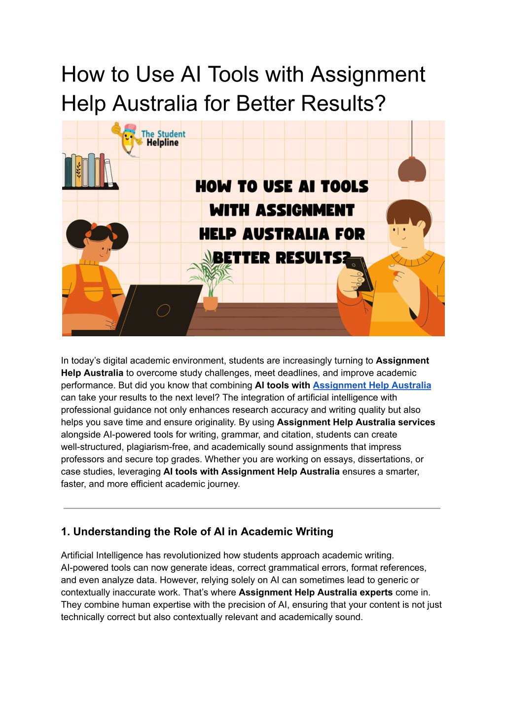 How to Use AI Tools with Assignment Help Australia for Better Results? In today’s digital academic environment, students are increasingly turning to Assignment Help Australia to overcome study challenges, meet deadlines, and improve academic performance. But did you know that combining AI tools with Assignment Help Australia can take your results to the next level? The integration of artificial intelligence with professional guidance not only enhances research accuracy and writing quality but also helps you save time and ensure originality. By using Assignment Help Australia services alongside AI-powered tools for writing, grammar, and citation, students can create well-structured, plagiarism-free, and academically sound assignments that impress professors and secure top grades. Whether you are working on essays, dissertations, or case studies, leveraging AI tools with Assignment Help Australia ensures a smarter, faster, and more efficient academic journey. 1. Understanding the Role of AI in Academic Writing Artificial Intelligence has revolutionized how students approach academic writing. AI-powered tools can now generate ideas, correct grammatical errors, format references, and even analyze data. However, relying solely on AI can sometimes lead to generic or contextually inaccurate work. That’s where Assignment Help Australia experts come in. They combine human expertise with the precision of AI, ensuring that your content is not just technically correct but also contextually relevant and academically sound.