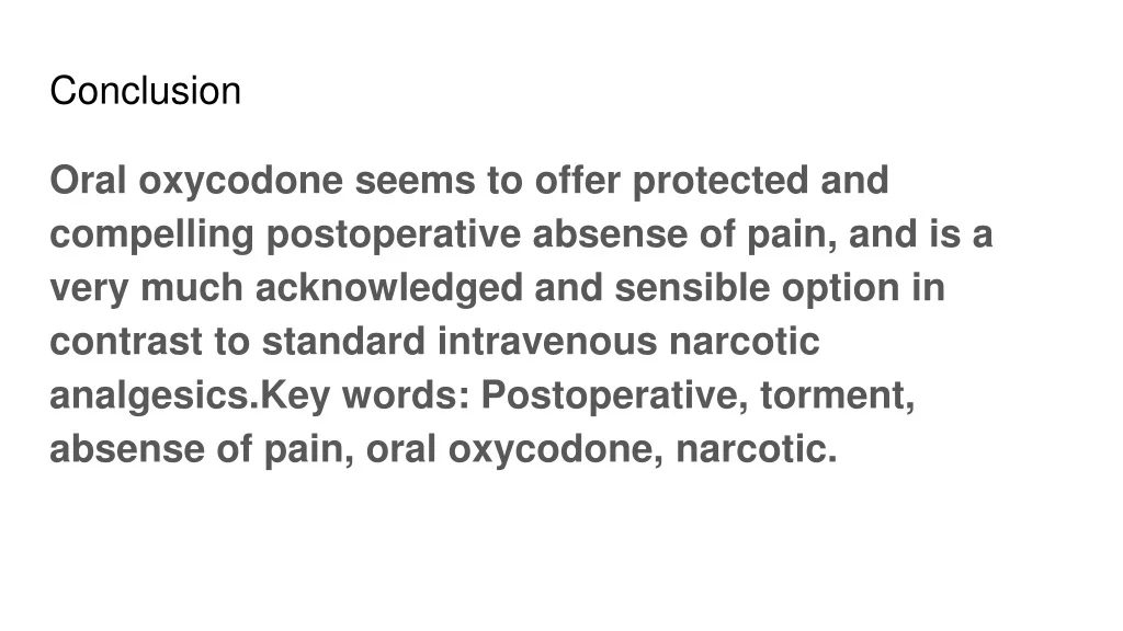 Conclusion Oral oxycodone seems to offer protected and compelling postoperative absense of pain, and is a very much acknowledged and sensible option in contrast to standard intravenous narcotic analgesics.Key words: Postoperative, torment, absense of pain, oral oxycodone, narcotic.