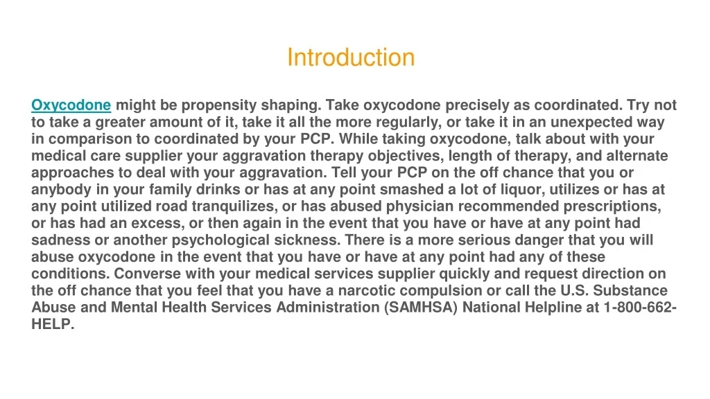 Introduction Oxycodone might be propensity shaping. Take oxycodone precisely as coordinated. Try not to take a greater amount of it, take it all the more regularly, or take it in an unexpected way in comparison to coordinated by your PCP. While taking oxycodone, talk about with your medical care supplier your aggravation therapy objectives, length of therapy, and alternate approaches to deal with your aggravation. Tell your PCP on the off chance that you or anybody in your family drinks or has at any point smashed a lot of liquor, utilizes or has at any point utilized road tranquilizes, or has abused physician recommended prescriptions, or has had an excess, or then again in the event that you have or have at any point had sadness or another psychological sickness. There is a more serious danger that you will abuse oxycodone in the event that you have or have at any point had any of these conditions. Converse with your medical services supplier quickly and request direction on the off chance that you feel that you have a narcotic compulsion or call the U.S. Substance Abuse and Mental Health Services Administration (SAMHSA) National Helpline at 1-800-662-HELP.
