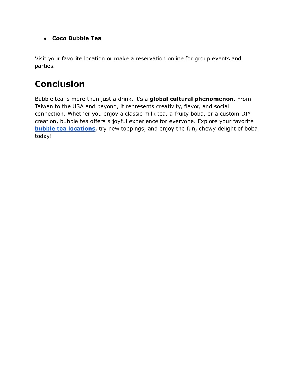 ● Coco Bubble Tea Visit your favorite location or make a reservation online for group events and parties. Conclusion Bubble tea is more than just a drink, it’s a global cultural phenomenon. From Taiwan to the USA and beyond, it represents creativity, flavor, and social connection. Whether you enjoy a classic milk tea, a fruity boba, or a custom DIY creation, bubble tea offers a joyful experience for everyone. Explore your favorite bubble tea locations, try new toppings, and enjoy the fun, chewy delight of boba today!