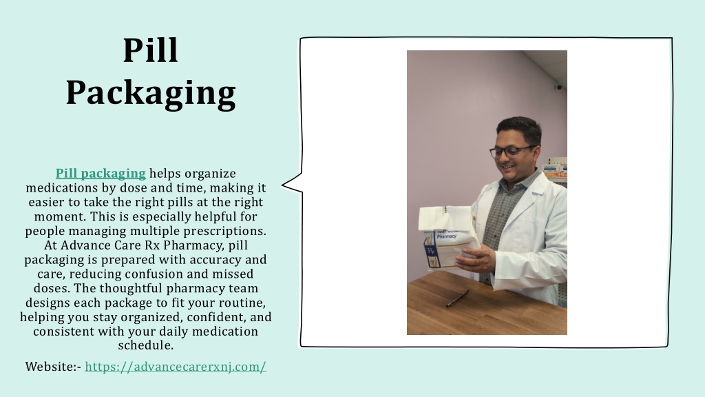 2. Pill Packaging Pill packaging helps organize medications by dose and time, making it easier to take the right pills at the right moment. This is especially helpful for people managing multiple prescriptions. At Advance Care Rx Pharmacy, pill packaging is prepared with accuracy and care, reducing confusion and missed doses. The thoughtful pharmacy team designs each package to fit your routine, helping you stay organized, confident, and consistent with your daily medication schedule. Website:- https://advancecarerxnj.com/