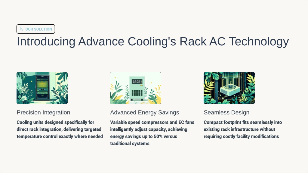 OUR SOLUTION Introducing Advance Cooling's Rack AC Technology Precision Integration Advanced Energy Savings Seamless Design Cooling units designed specifically for direct rack integration, delivering targeted temperature control exactly where needed Variable speed compressors and EC fans intelligently adjust capacity, achieving energy savings up to 50% versus traditional systems Compact footprint fits seamlessly into existing rack infrastructure without requiring costly facility modifications