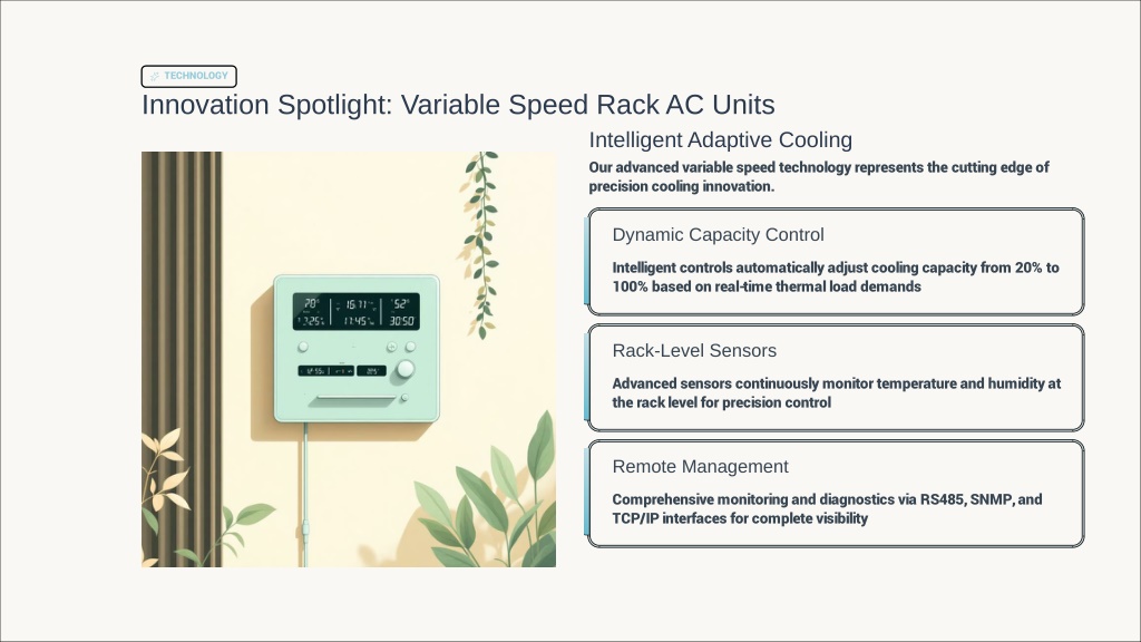 TECHNOLOGY Innovation Spotlight: Variable Speed Rack AC Units Intelligent Adaptive Cooling Our advanced variable speed technology represents the cutting edge of precision cooling innovation. Dynamic Capacity Control Intelligent controls automatically adjust cooling capacity from 20% to 100% based on real-time thermal load demands Rack-Level Sensors Advanced sensors continuously monitor temperature and humidity at the rack level for precision control Remote Management Comprehensive monitoring and diagnostics via RS485, SNMP, and TCP/IP interfaces for complete visibility