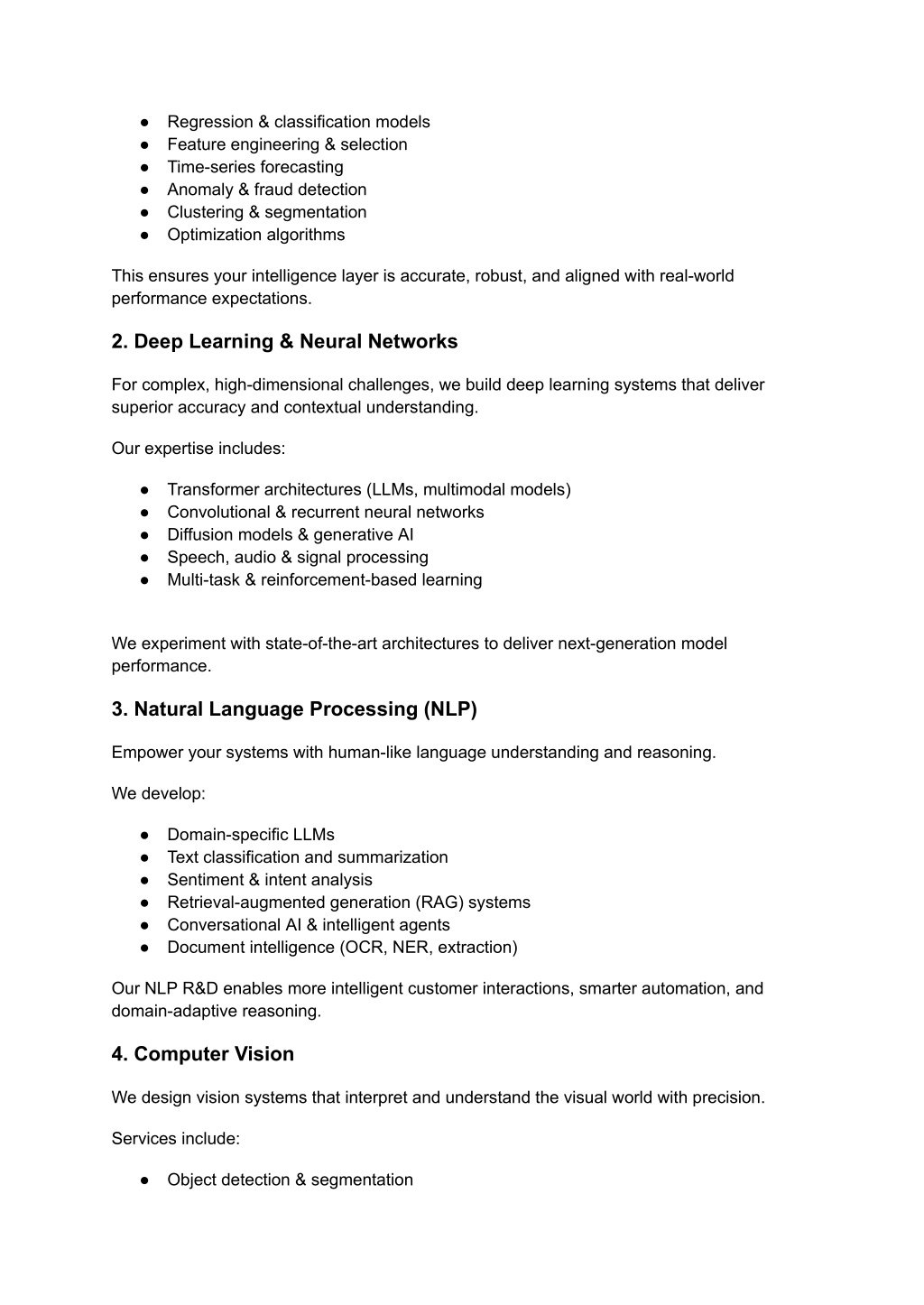 ● Regression & classification models ● Feature engineering & selection ● Time-series forecasting ● Anomaly & fraud detection ● Clustering & segmentation ● Optimization algorithms This ensures your intelligence layer is accurate, robust, and aligned with real-world performance expectations. 2. Deep Learning & Neural Networks For complex, high-dimensional challenges, we build deep learning systems that deliver superior accuracy and contextual understanding. Our expertise includes: ● Transformer architectures (LLMs, multimodal models) ● Convolutional & recurrent neural networks ● Diffusion models & generative AI ● Speech, audio & signal processing ● Multi-task & reinforcement-based learning We experiment with state-of-the-art architectures to deliver next-generation model performance. 3. Natural Language Processing (NLP) Empower your systems with human-like language understanding and reasoning. We develop: ● Domain-specific LLMs ● Text classification and summarization ● Sentiment & intent analysis ● Retrieval-augmented generation (RAG) systems ● Conversational AI & intelligent agents ● Document intelligence (OCR, NER, extraction) Our NLP R&D enables more intelligent customer interactions, smarter automation, and domain-adaptive reasoning. 4. Computer Vision We design vision systems that interpret and understand the visual world with precision. Services include: ● Object detection & segmentation
